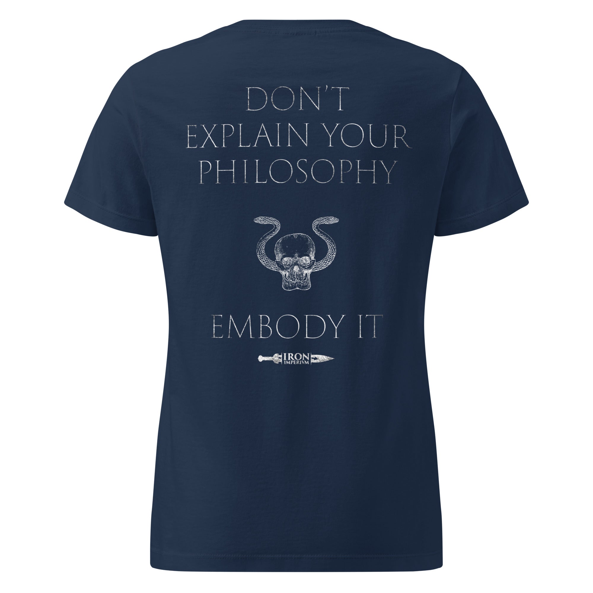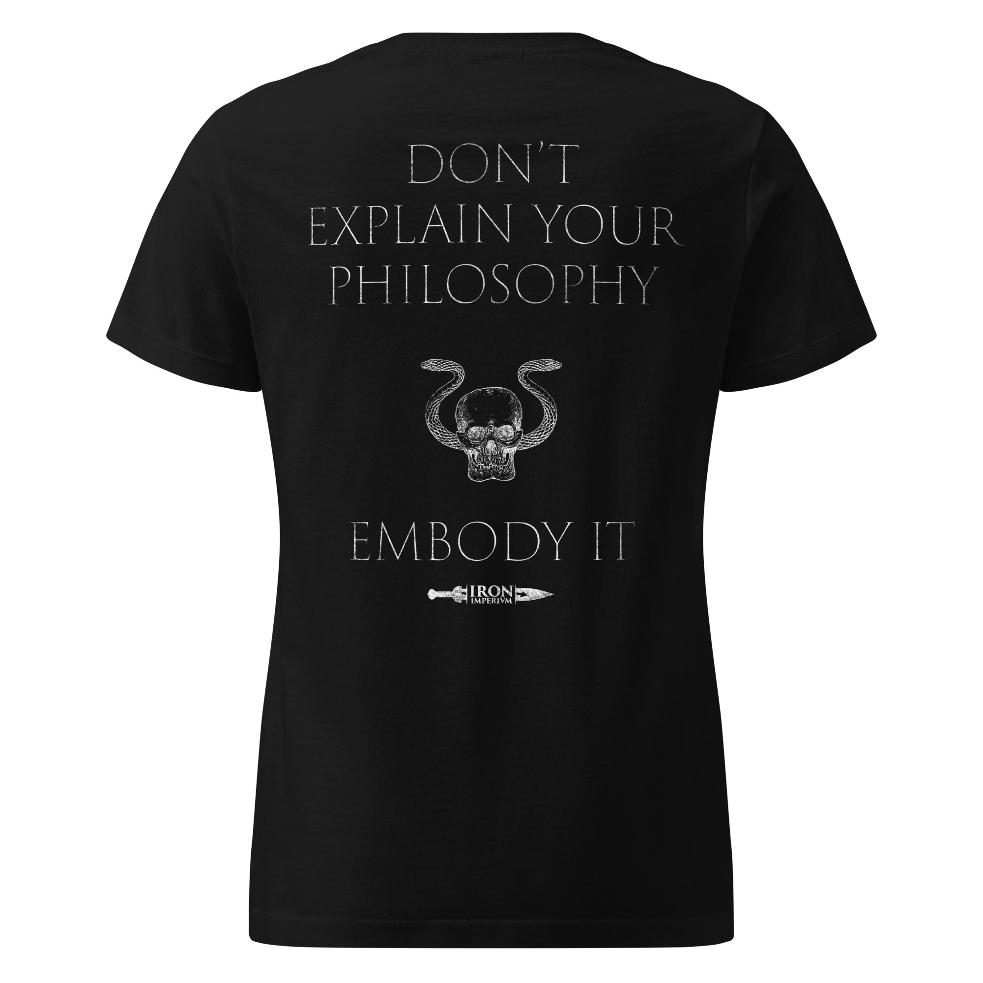 Back: The Stoic command “Do not explain your philosophy. Embody it.” framed by exclusive Baxter details, transforming words into living art.